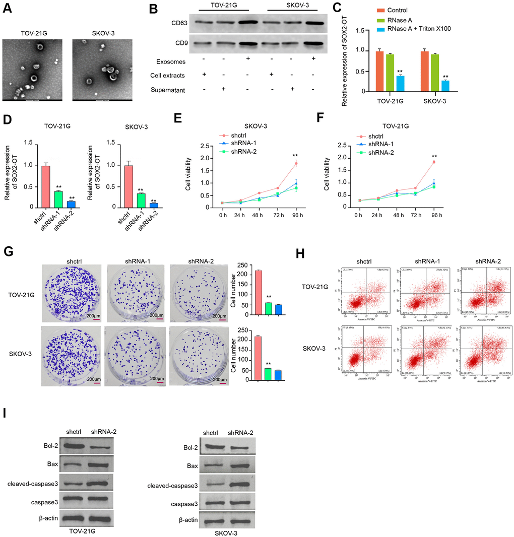 Next, the role of exosomal SOX2-OT in ovarian cancer was analyzed. The exosome was extracted from the culture medium of TOV-21G and SKOV-3 cells and the characteristic were shown by TEM (Figure 2A). Besides, the expression levels of CD63 and CD9 were identified in the exosome of the TOV-21G and SKOV-3 cells (Figure 2B). In addition, the SOX2-OT expression was tested in culture medium treated with RNase A or co-treated with RNase A and Triton X-100. Our data showed that the SOX2-OT expression was unacted on the treatment of RNase A while significantly reduced upon the simultaneous co-treatment of RNase A and Triton X-100 (Figure 2C). Next, the efficiency of SOX2-OT depletion was validated in the TOV-21G and SKOV-3 cells (Figure 2D). Significantly, the cell proliferation was reduced by the depletion of SOX2-OT in the cells (Figure 2E). Meanwhile, the colony formation assays confirmed the similar results in the cells (Figure 2F). Moreover, the SOX2-OT knockdown induced the apoptosis of TOV-21G and SKOV-3 cells (Figure 2G, 2H). Consistently, the depletion of SOX2-OT reduced Bcl-2 expression while enhanced Bax and cleaved-caspase3 expression in the cells (Figure 2I).