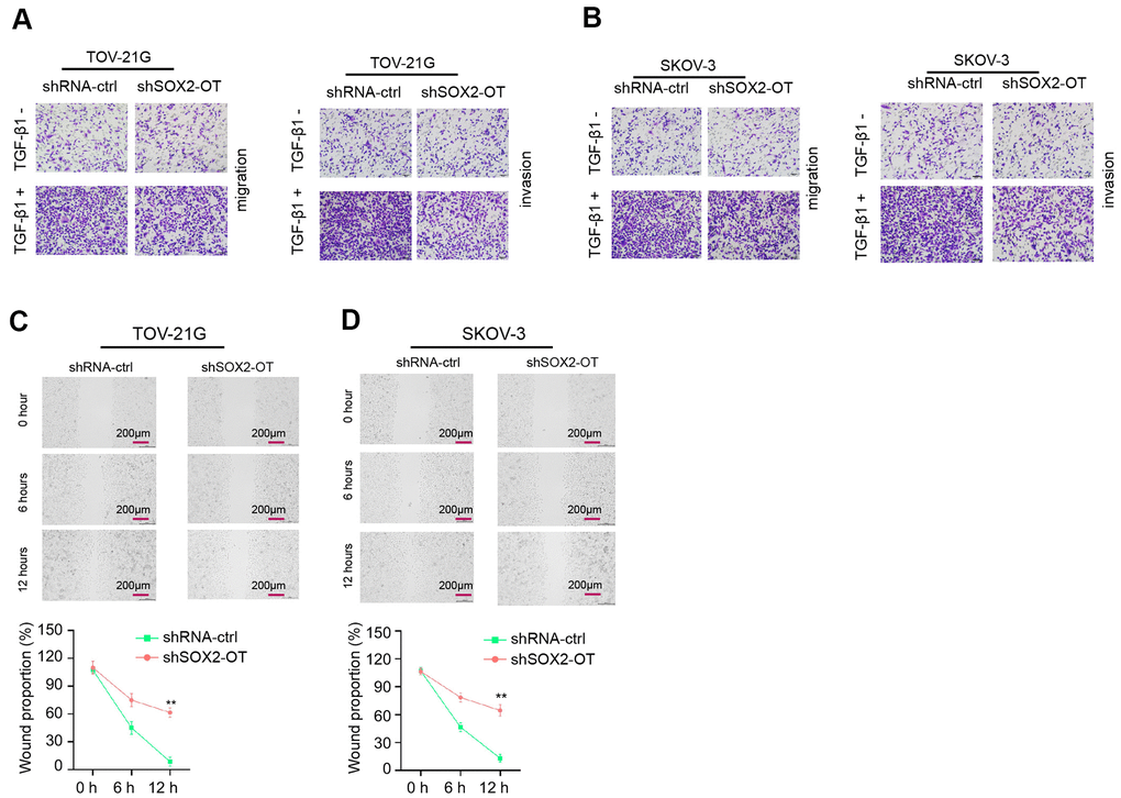 Then, we revealed that TOV-21G and SKOV-3 cell invasion and migration were increased by SOX2-OT knockdown (Figure 3A, 3B). Similarly, the depletion of SOX2-OT significantly enhanced wound healing proportion (Figure 3C, 3D), indicating that exosomal SOX2-OT induces invasion and migration.