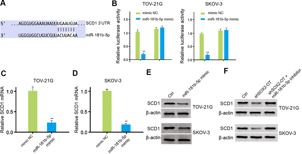The miR-181b-5p-targeted site in SCD1 3’ UTR was found in a bioinformatic analysis (Figure 5A). Significantly, the luciferase activities of SCD1, but not SCD1 mutant, were reduced by miR-181b-5p mimic in the TOV-21G and SKOV-3 cells (Figure 5B). Moreover, the expression level of SCD1 was remarkably down-regulated by miR-181b-5p mimic in the cells (Figure 5C, 5D). In addition, the levels of SCD1 was up-regulated by SOX2-OT knockdown, while the miR-181b-5p inhibitor could reverse this effect in the TOV-21G and SKOV-3 cells (Figure 5E, 5F).