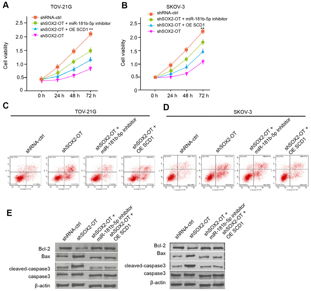 The TOV-21G and SKOV-3 cells were maintained in the lab. The TOV-21G and SKOV-3 cells were incubated at the incubator of 5% CO2 and 37° C in the DMEM medium (Hyclone, USA) with penicillin (100 units/mL, Hyclone, USA), streptomycin (0.1 mg/mL, Hyclone, USA), and FBS (10%, Hyclone, USA). The control shRNA, SOX2-OT shRNA, pcDNA3.1-SCD1, mimic and inhibitor of miR-181b-5p were purchased from GenePharma (China). SOX2-OT shRNA-1: GCACCGCTATACAGAGAAACCTTATCCTCGAGGATAAGGTTTCTCTGTATAGCTTTTTTG; SOX2-OT shRNA-2: GCACCGGAGCAAAGGTGCTGTCATTTCTCGAGAAATGACAGCACCTTTGCTCCTTTTTG.