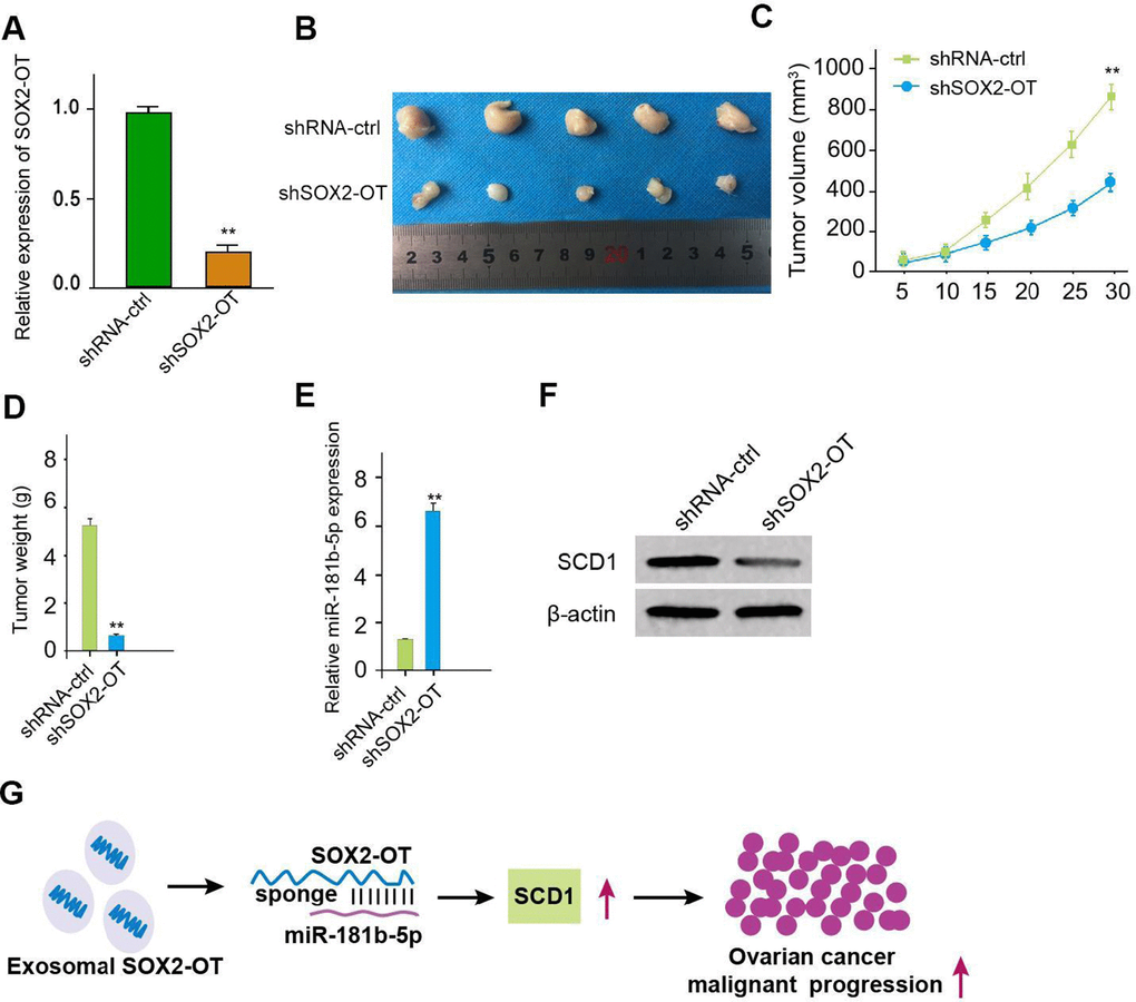 We then evaluated the role of exosomal SOX2-OT in the ovarian cancer progression in vivo by the tumorigenicity analysis. The expression of inhibited SOX2-OT was validated in the system (Figure 7A). Significantly, the exosomal SOX2-OT depletion could attenuate the tumor size, volume, and weight (Figure 7B–7D). MiR-181b-5p expression was increased but the SCD1 expression down-regulated in tumor tissues (Figure 7E, 7F), indicating that exosomal SOX2-OT promotes tumor growth of ovarian cancer in vivo.