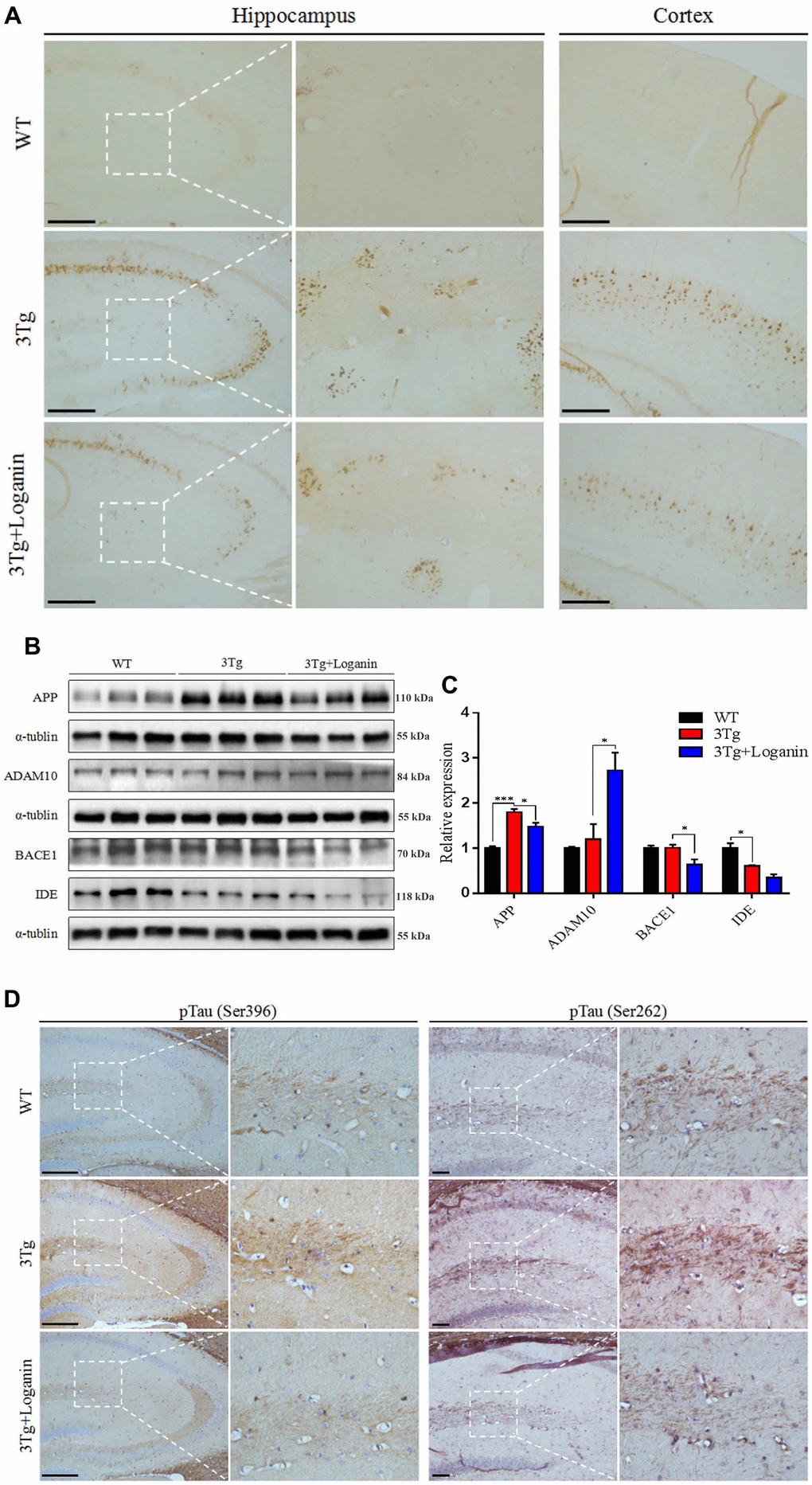 To determine whether Tau protein phosphorylation was decreased in loganin-treated 3xTg-AD mice, we evaluated the levels of pTauS396 and pTauS262 in the hippocampal brain sections by immunohistochemistry. The data displayed that the 3xTg-AD mice had increased Tau phosphorylation at both serine396 and serine262 in hippocampus relative with WT mice. However, loganin treatment displayed a decreasing trend of the levels of Tau phosphorylation in 3xTg-AD mice treated with loganin (Figure 2D).