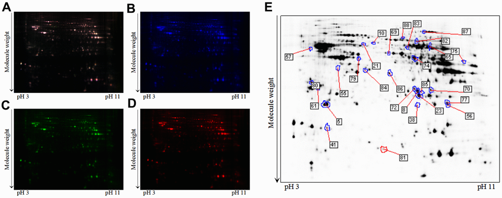In present study, 2D-DIGE was performed as previously described [36]. After overnight rehydration of the strips with 75 μg of mixed protein sample, the strips were carried out the first-dimension isoelectric focusing (IEF) by using the IEF system (GE Healthcare, USA). IEF was performed according to the following condition (i.e. 50 V, 18h; 300 V, 12 h; 500 V, 2 h; 1000 V, 2 h; 8000 V, 8 h). After IEF, strips were incubated with equilibration buffer (30% glycerol, 6 M urea, 75 mM Tris-HCl buffer (pH 8.8), 2% SDS) supplemented with 1% DTT for 15 min, followed with 4.5% IAA in same buffer for 15 min. The equilibrated strips were performed the second dimension SDS-PAGE with 12.5% SDS-PAGE gels. Then, 2D-DIGE gels were scanned on the Typhoon TRIO Variable Mode Imager (GE Healthcare, USA). To minimize the variation from different 2D-DIGE gels, PMT was adjusted to ensure that the maximum pixel intensity of each image was in the range of 40,000-60,000 pixels.