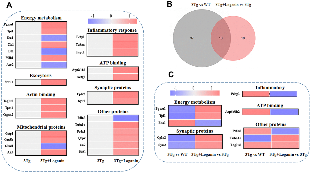 To determine the functional categories of differentially expressed proteins from the 3xTg-AD mice treated with loganin compared with the control mice, a web-based portal called metascape that was an effective and efficient tool for omics analysis was used to analyze the function of proteins. Combined with heatmap analysis, these differentially expressed proteins from the loganin-treated 3xTg-AD mice compared with the control mice were mainly divided into following categories, including energy metabolism, exocytosis, actin binding, mitochondrial proteins, inflammatory response, ATP binding, synaptic proteins, and other proteins (Figure 4A). And red expressed upregulation and blue expressed downregulation, and the greater the fold change, the brighter the image. In addition, 10 differentially expressed proteins found in the three groups were further divided into the following function including energy metabolism, synaptic proteins, inflammatory response, ATP binding and other proteins (Figure 4B, 4C). These data indicated that some functional clustering (i.e. energy metabolism, synaptic proteins, and inflammatory response) may be play an important role in loganin-caused neuroprotection of 3xTg-AD mice.
