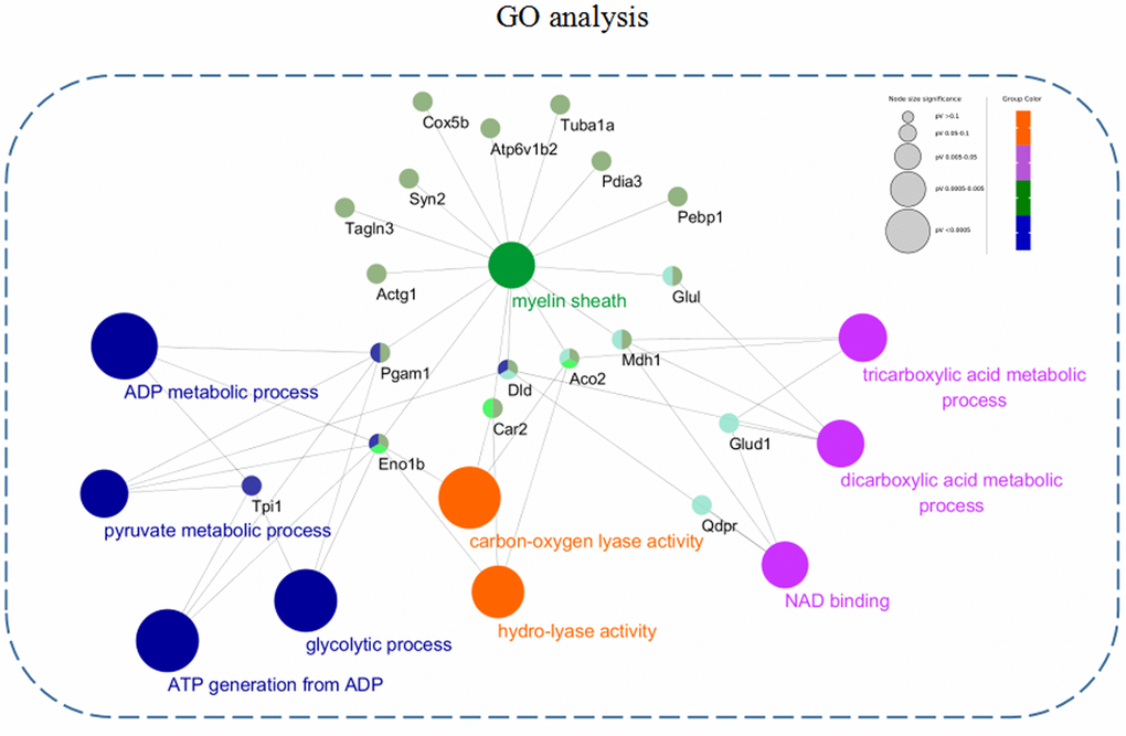 In order to further describe the distributions of GO annotation enrichment of the differentially expressed proteins. A Cytoscape plug-in ClueGo (version 2.5.1) was used to conduct and visualize functionally grouped network of terms involving in biological process (BP), molecular function (MF), and cellular component (CC). As shown in Figure 5, these differentially expressed proteins from the 3xTg-AD mice treated with loganin compared with the control mice were enriched in following subterms including ADP metabolic process, pyruvate metabolic process, glycolytic process, ATP generation from ADP, carbon-oxygen lyase activity, hydro-lyase activity, tricarboxylic acid metabolic process, dicarboxylic acid metabolic process, NAD binding, and myelin sheath. Different colour represented main classification of GO enrichment, and the bigger the circle changed, the better the enrichment. Notably, the different subterms were closely linked by some differentially expressed proteins such as Eno1, Pagm1, Car2, Dld, Aco2, Mdh1, and Glu1, suggesting that loganin-induced neuroprotective effects may be regulated by these molecules above.