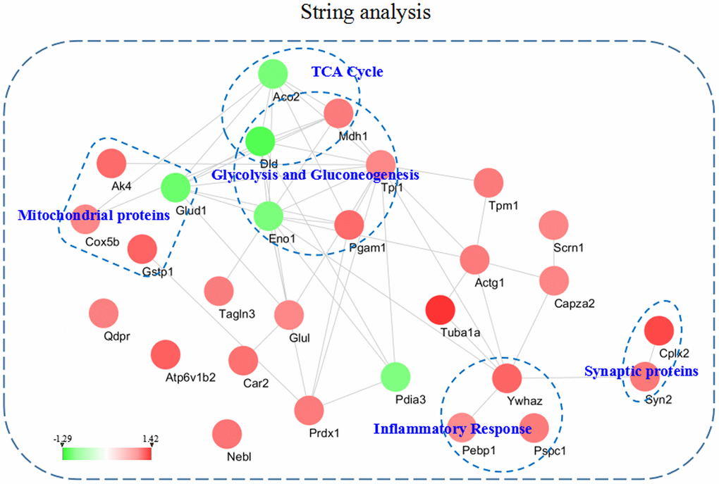 To better understand the functional connectivity of the differentially expressed proteins, we used the STRING linked with Cytoscape 3.6.1 to plot and visualize the PPI network. Some molecules from the 3xTg-AD mice treated with loganin compared with the control mice involved in TCA cycle, glycolysis and gluconeogenesis, mitochondrial proteins, inflammatory response, and synaptic proteins were differentially affected and obviously highlighted in PPI network. As was shown in Figure 6, the PPI network again indicated that some differentially expressed proteins such as Enol, Pagm1, etc. were closely related with other molecules.
