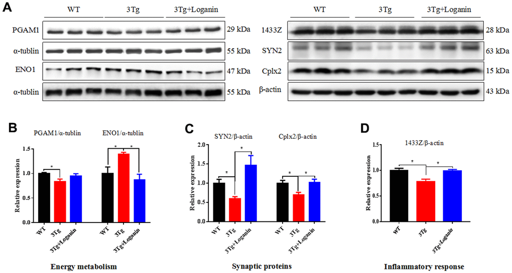 According the results of proteomics analysis, we found that energy metabolism, synaptic proteins, and inflammatory response were abnormally regulated by loganin treatment in the 3xTg-AD mice. Furthermore, the expression levels of several key proteins (i.e. PAGM1, ENO1, SYN2, Cplx2, and 1433Z) involving in the above three aspects were validated by western blot. Compared to the control mice, the expression of PAGM1, SYN2, Cplx2, and 1433Z were determined to be upregulated and the expression of ENO1 was determined to be downregulated in the 3xTg-AD mice treated with loganin (Figure 7A–7D). The data indicated that the results of western blot were consistent with that of proteomics.