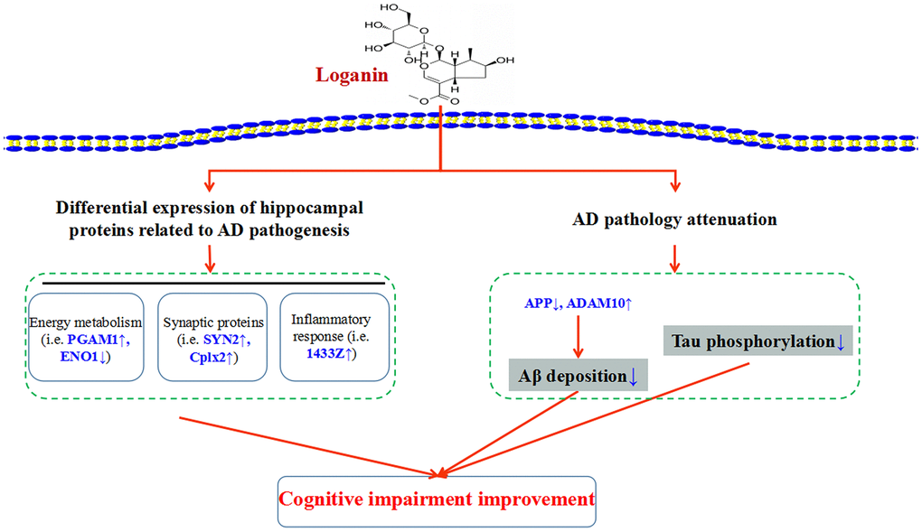 As depicted in Figure 8, our data suggested that loganin could ameliorate Aβ deposition, improve tau pathology and prevent cognitive impairment in 3xTg-AD mice. Proteomics analysis further elucidated the possible mechanism of the loganin-induced neuroprotective effects of 3xTg mice. Namely, these differentially expressed proteins from the 3xTg-AD mice treated with loganin compared to the control mice may directly regulate cognitive deficits of the 3xTg-AD mice via modulating the expression of key molecules (i.e. PAGM1, ENO1, SYN2, Cplx2, and 1433Z), and may be indirectly involved in the regulation of AD pathology and thus affected cognitive impairment of the 3xTg-AD mice. Therefore, our study provided more evidence that loganin could be used as a feasible candidate drug for the prevention and treatment of AD.