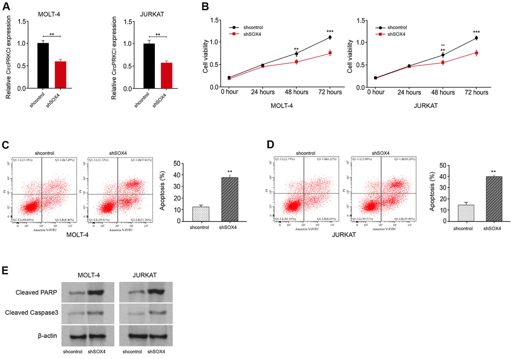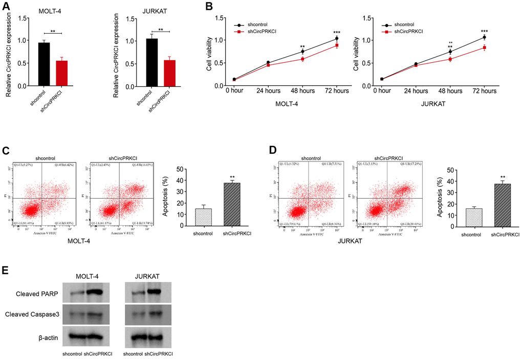 We then explored the function of circPRKCI in the mediation of T-ALL cell survival in vitro. To this end, the T-ALL MOLT-4 and JURKAT cell lines were treated with circPRKCI shRNA and the treatment efficacy of circPRKCI shRNA was validated in the cells (Figure 2A). The silencing of circPRKCI using shRNA suppressed the viability of MOLT-4 and JURKAT cells (Figure 2B). Conversely, the knockdown of circPRKCI promoted the apoptosis of MOLT-4 and JURKAT cells (Figure 2C, 2D). Consistently, the levels of cleaved PARP and cleaved caspase3 were induced by the depletion of circPRKCI in MOLT-4 and JURKAT cells (Figure 2E), indicating that CircPRKCI knockdown suppresses T-ALL cell survival in vitro.