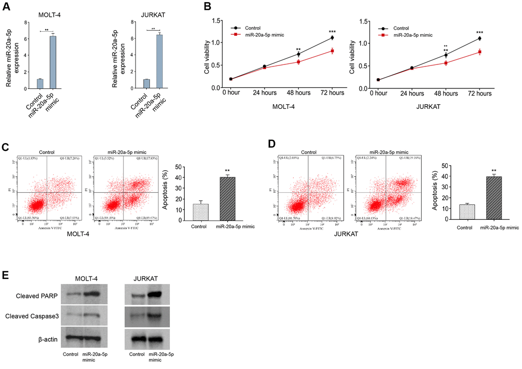 Then, we validated the function of miR-20a-5p in the modulation of T-ALL cell survival in vitro. For this purpose, the T-ALL MOLT-4 and JURKAT cell lines were treated with miR-20a-5p mimic and the treatment efficacy of miR-20a-5p mimic was confirmed in the cells (Figure 4A). The treatment of miR-20a-5p mimic inhibited the viability of MOLT-4 and JURKAT cells (Figure 4B). Reversely, miR-20a-5p mimic enhanced the apoptosis of MOLT-4 and JURKAT cells (Figure 4C, 4D). Similarly, the levels of cleaved PARP and cleaved caspase3 were increased by miR-20a-5p mimic in MOLT-4 and JURKAT cells (Figure 4E), indicating that miR-20a-5p represses T-ALL cell survival in vitro.