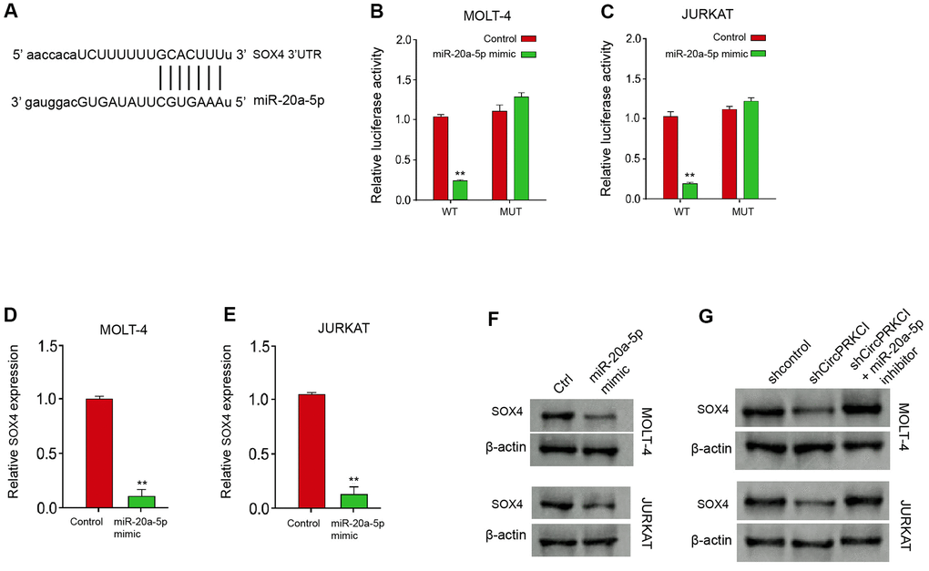 We then investigated the interaction of miR-20a-5p and SOX4. We found the predicted binding site between SOX4 and miR-20a-5p in the bioinformatics analysis (Figure 5A). The luciferase activity of SOX4 was significantly suppressed in MOLT-4 and JURKAT cells after the treatment of miR-20a-5p mimic (Figure 5B, 5C). Both mRNA and protein levels of SOX4 were remarkably repressed by the treatment of miR-20a-5p mimic in MOLT-4 and JURKAT cells (Figure 5D–5F). Crucially, the expression of SOX4 was decreased in MOLT-4 and JURKAT cells after the depletion of circPRKCI using shRNA, while the inhibitor of miR-20a-5p could rescue the decrease in the cells (Figure 5G).