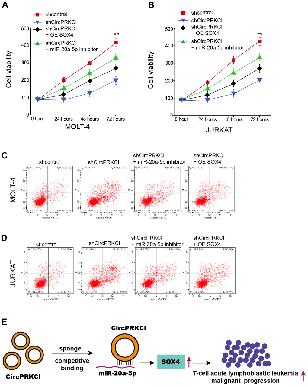 Then, we tried to assess the correlation of circPRKCI, miR-20a-5p, and SOX4 in the modulation of T-ALL cell survival in vitro. As expected, the MOLT-4 and JURKAT cell viability was reduced by circPRKCI silencing, while the overexpression of SOX4 or suppression of miR-20a-5p rescued the reduced viability in MOLT-4 and JURKAT cells (Figure 7A, 7B). Besides, the knockdown of circPRKCI enhanced MOLT-4 and JURKAT cell apoptosis, and SOX4 re-expression or miR-20a-5p inhibition could reverse this enhancement (Figure 7C, 7D).