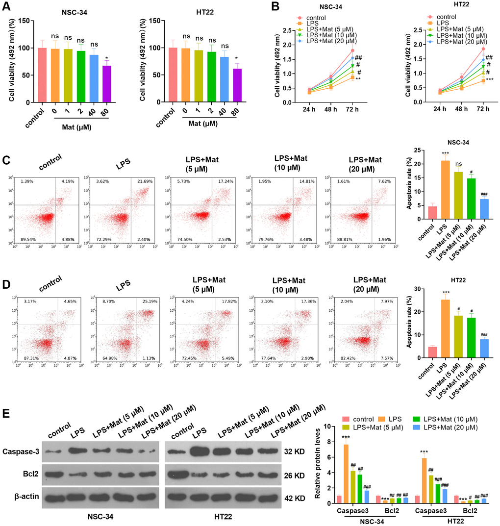 With the purpose of exploring the effect of Mat on neurons, different concentrations of Mat (0, 1, 2, 40, 80 μM) were applied to NSC-34 and HT22 neurons. MTS analysis results illustrated that Mat notably hindered cell viability when its concentration was greater than 40 μM (P < 0.05, Figure 1A), suggesting that the toxicity of Mat to neurons was minimal. Then, NSC-34 and HT22 cells were treated with varying concentrations of Mat (5, 10, 20 μM) following LPS treatment. MTS analysis uncovered that LPS distinctly impeded cell proliferation (vs. the control group). However, Mat (>5 μM) heightened the proliferative ability of cells (vs. the LPS alone intervention group) (P < 0.05, Figure 1B). As testified by FCM data, LPS heightened apoptosis (vs. the control group), while Mat (>5 μM) significantly repressed apoptosis in contrast to that of the LPS group (P < 0.05, Figure 1C–1D). WB data displayed that LPS elevated the expression of pro-apoptotic protein Caspase3 and dampened the profile of anti-apoptotic protein Bcl2 (vs. the control group). However, Mat attenuated this effect (vs. the LPS group) (P < 0.05, Figure 1E). These outcomes illustrated that Mat weakened the anti-proliferative and pro-apoptotic effects of LPS on neurons, thus mitigating the damage of LPS on neurons.