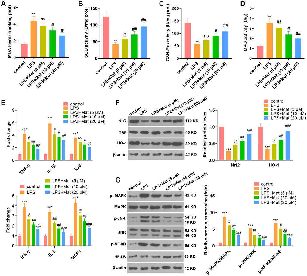To clarify the effect of Mat on microglia, BV2 were treated with different concentrations (5 to 20 μM) of Mat following LPS treatment. The results of the BCA protein detection kit manifested that by contrast with the control group, LPS enhanced the production of MDA and hampered the activities of SOD, CAT and GSH-Px, while Mat (>5 μM) significantly impeded this effect (vs. the LPS group) (P < 0.05, Figure 2A–2D). ELISA results hinted that LPS heightened the generation of inflammatory cytokines (TNF-α, IL-1β, IL-6, IFN-γ, IL-8 and MCP1), while Mat repressed the production of these inflammatory cytokines compared with that of the LPS group (P < 0.05, Figure 2E). The profiles of oxidative stress proteins (Nrf2 and HO-1) and inflammatory proteins (MAPK, JNK and NF-κB) were monitored by WB. As a result, in contrast to the control group, LPS repressed the profiles of Nrf2 and HO-1 and strengthened the phosphorylation of MAPK, JNK and NF-κB. Nevertheless, further application of Mat following LPS treatment brought about the reverse effect (P < 0.05, Figure 2F–2G). Overall, LPS induced oxidative stress and inflammation in microglia, and Mat attenuated the effect of LPS.