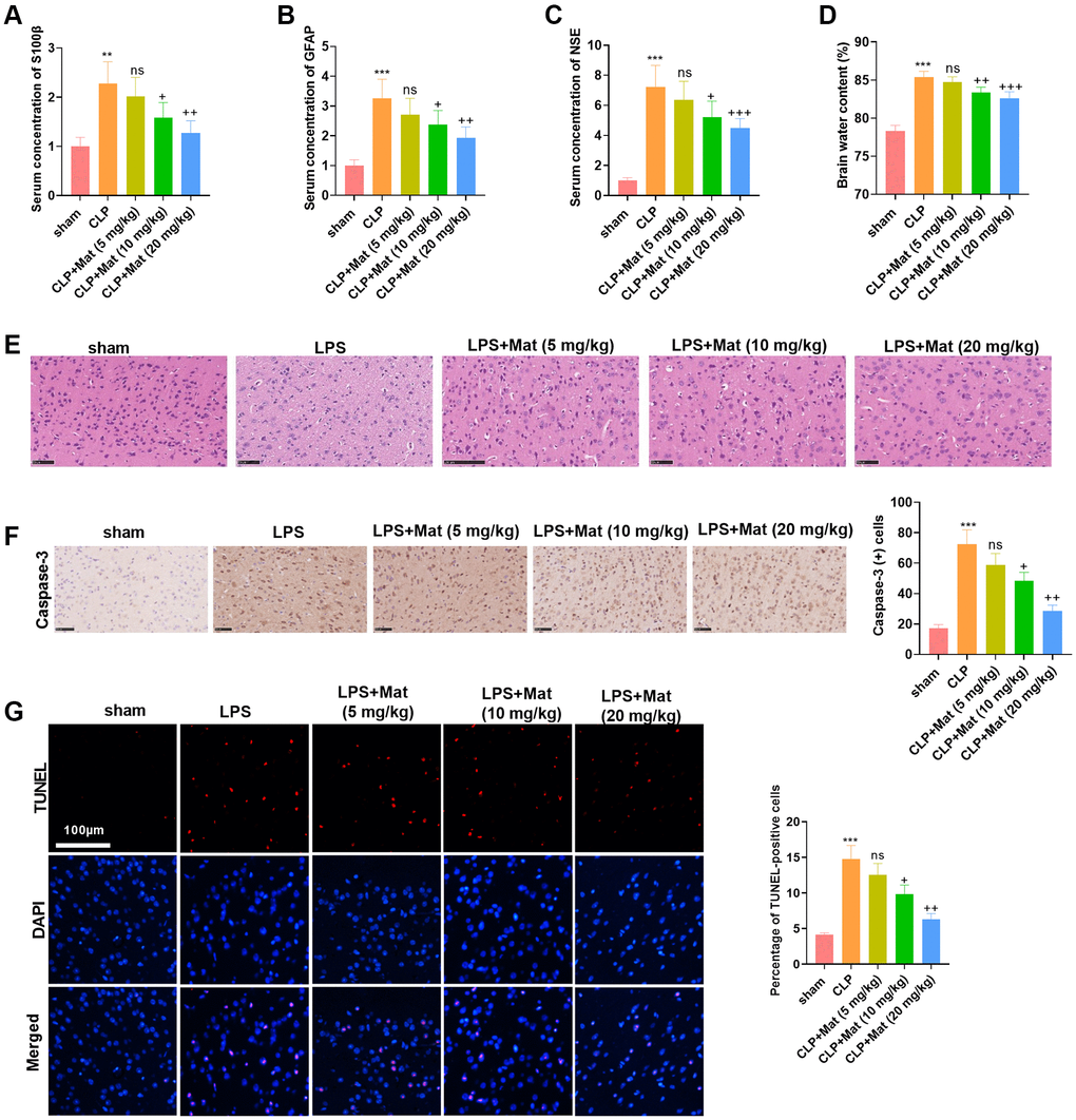 A rat sepsis model was constructed by CLP surgery, based on which rats were given oral doses of Mat at different concentrations (5 to 20 mg/kg). Blood analysis revealed that serum concentrations of S100β, GFAP, and neuron-specific enolase (NSE) were significantly increased after CLP, while Mat (>5 mg/kg) dampened the production of S100β, GFAP, and NSE (vs. the CLP group) (P < 0.05, Figure 3A–3C). No significant effect of CLP and Mat on brain edema was observed in the wet/dry method (P > 0.05, Figure 3D). H&E staining of rat brain tissues exhibited that the neurons in the sham group were basically structurally intact with normal neuronal morphology, clear cytoplasm, and uniformly clear cortical nuclei, while those in the CLP group were abnormally disorganized with vacuoles. However, the use of Mat on the basis of CLP attenuated the damage of CLP to brain tissues and neurons (Figure 3E). IHC results testified that CLP elevated the Caspase-3 expression in the cortex, while Mat (>5 mg/kg) significantly dampened the Caspase-3 profile (vs. the CLP group) (P < 0.05, Figure 3F). Then, TUNEL staining data revealed that CLP heightened the number of apoptotic cells, while Mat (>5 mg/kg) repressed cell apoptosis in comparison to that of the CLP group (P < 0.05, Figure 3G). These outcomes manifested that Mat had an inhibitory effect on CLP-induced acute brain injury in rats.