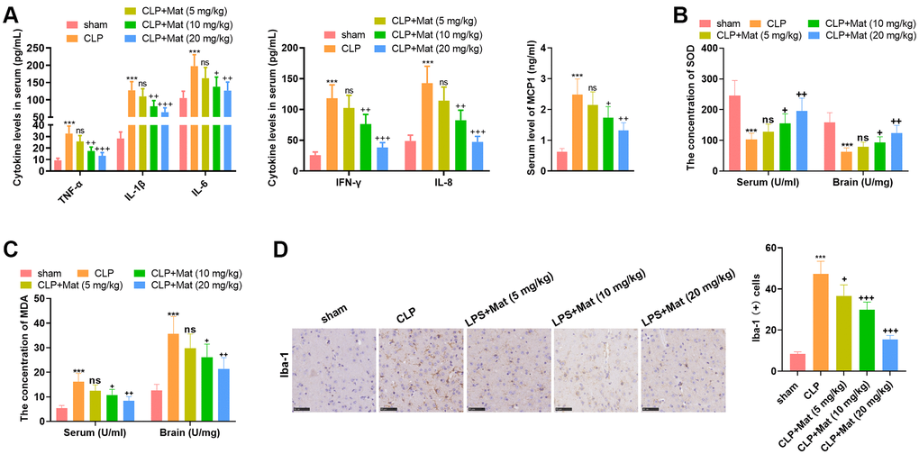 The treatment of experimental animals is shown in Figure 3. ELISA results confirmed that LPS facilitated the generation of TNF-α, IL-1β, IL-6, IFN-γ, IL-8 and MCP1, while Mat (>5 mg/kg) treatment following CLP administration curbed the production of TNF-α, IL-1β, IL-6, IFN-γ, IL-8 and MCP1 (P < 0.05, Figure 4A). The BCA protein detection kit was adopted to test the concentration of oxidative stress molecules in the serum and brain tissues. It turned out that CLP facilitated the MDA production and hampered the SOD activity (vs. the sham group), while Mat declined the MDA level and increased the SOD activity (vs. the CLP group) (P < 0.05, Figure 4B–4C). After the CLP surgery, IHC results showed a rapid increase in the Iba-1 positive cell number, which was suppressed by Mat (vs. the CLP group) (P < 0.05, Figure 4D). These data revealed that Mat hampered CLP-mediated microglial activation. Thus, Mat inhibited CLP-mediated oxidative stress, inflammation, and microglial activation in vivo.