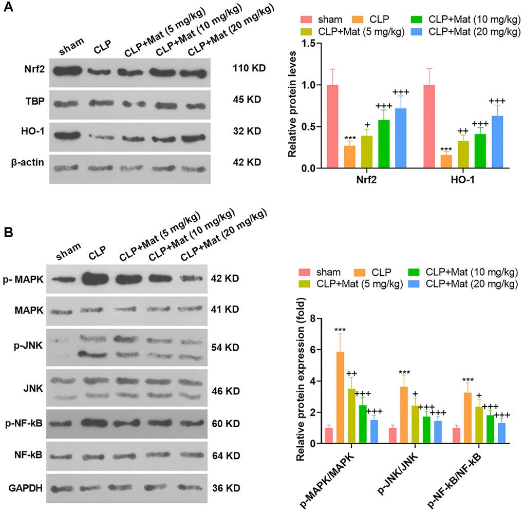 The treatment of experimental animals was the same as that in Figure 3. After the CLP surgery, the expression of antioxidant proteins Nrf2 and HO-1 was suppressed, while the phosphorylation of inflammatory proteins MAPK, JNK and NF-κB was promoted, as evidenced by WB. Nevertheless, Mat treatment at varying concentrations following the CLP surgery significantly suppressed the inhibition of CLP on Nrf2 and HO-1 and its facilitation on MAPK, JNK and NF-κB (P < 0.05, Figure 5A–5B). These outcomes suggested that Mat repressed the CLP-activated MAPK and NF-κB pathways.