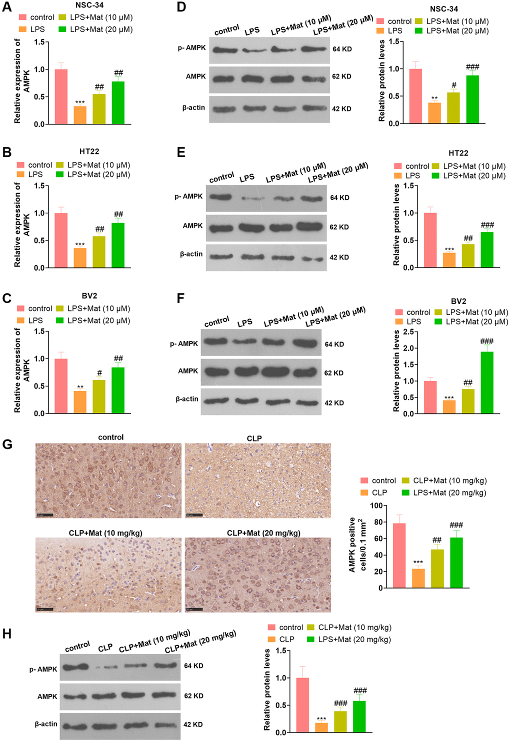 NSC-34, HT22 and BV2 cells were processed with LPS alone or in combination with Mat (10, 20 μM). qRT-PCR and WB affirmed that LPS repressed the AMPK expression at mRNA and protein levels (vs. the control group). In contrast, compared with the LPS group, Mat elevated the AMPK expression concentration-dependently (P < 0.05, Figure 6A–6F). Besides, Mat (10, 20 mg/kg) and CLP were applied jointly to treat the rats. IHC results illustrated that CLP abated the AMPK expression in tissues (vs. the control group), while Mat strengthened the AMPK level (vs. the CLP group) (P < 0.05, Figure 6G). WB hinted that the AMPK phosphorylation was reduced by CLP, while it was increased after Mat administration (vs. the CLP group) (P < 0.05, Figure 6H). These results manifested that Mat elevated the AMPK expression.