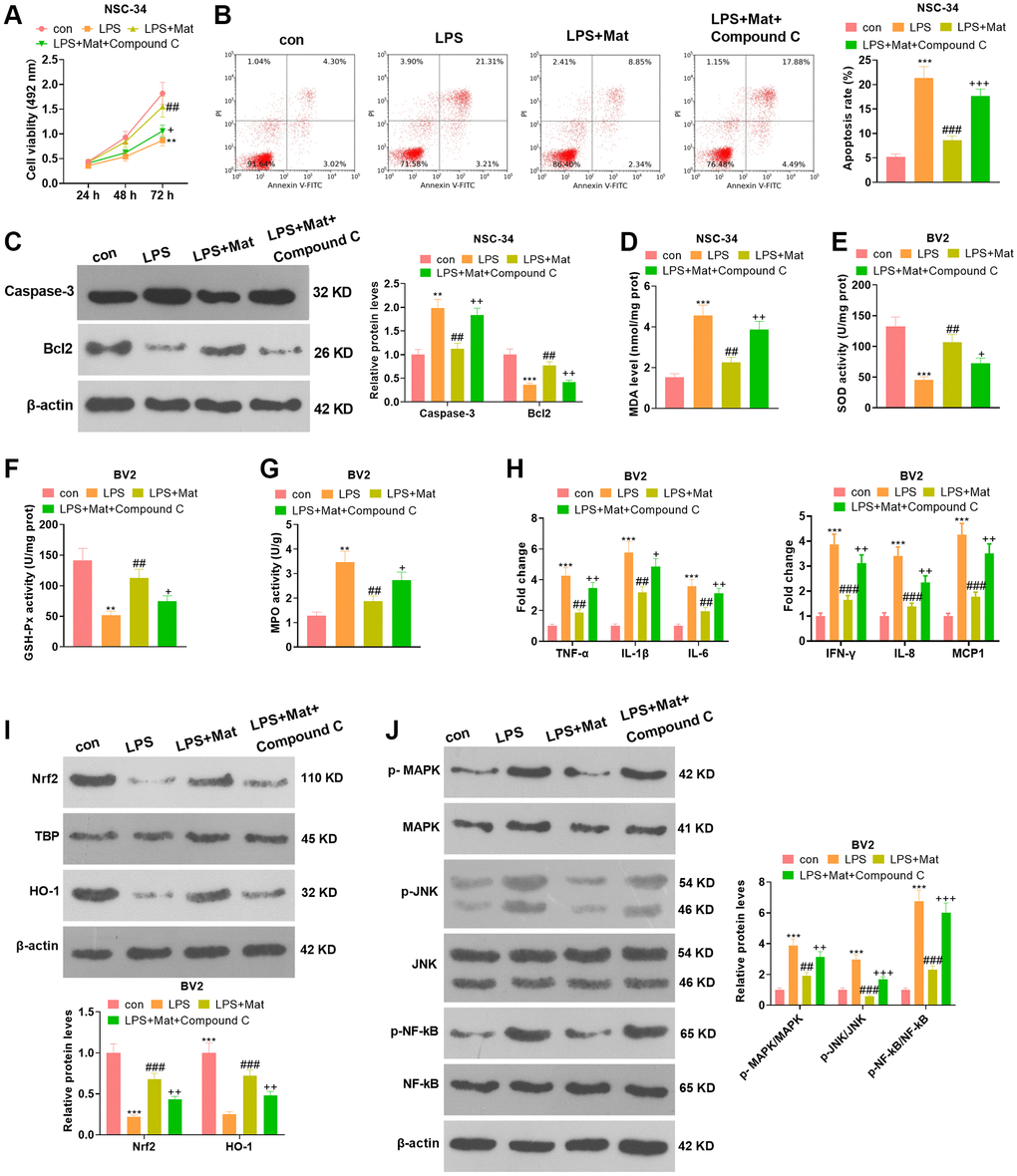 NSC-34 and BV2 cells were treated with Mat (20 μM) alone or in combination with Compound C (the AMPK pathway inhibitor) following LPS treatment. Cell counting kit-8 (CCK-8) assay disclosed that Compound C signally abated NSC-34 cell proliferation (vs. the LPS+Mat group) (P < 0.05, Figure 7A). FCM revealed that the apoptotic rate of NSC-34 was increased after Compound C treatment (vs. the LPS+ Mat group) (P < 0.05, Figure 7B). The expression of apoptosis-related proteins was compared by WB. As a result, Compound C significantly facilitated Caspase-3 and curbed Bcl2 expression (vs. the LPS+Mat group) (P < 0.05, Figure 7C). The results of the BCA protein assay kit exhibited significant facilitation in MDA release and notable attenuation in SOD, CAT and GSH-Px activities after Compound C treatment (vs. the LPS+Mat group) (P < 0.05, Figure 7D–7G)). Additionally, ELISA testified that Compound C significantly facilitated the production of TNF-α, IL-1β, IL-6, IFN-γ, IL-8 and MCP1 in NSC-34 (vs. the LPS+Mat group) (P < 0.05, Figure 7H). Moreover, WB indicated that Compound C hampered the expression of Nrf2 and HO-1 and augmented the phosphorylation of MAPK, JNK and NF-κB in BV2 cells (vs. the LPS+ Mat group) (P < 0.05, Figure 7I–7J). Hence, attenuating AMPK impeded Mat-mediated neuron-protective and anti-inflammatory effects.