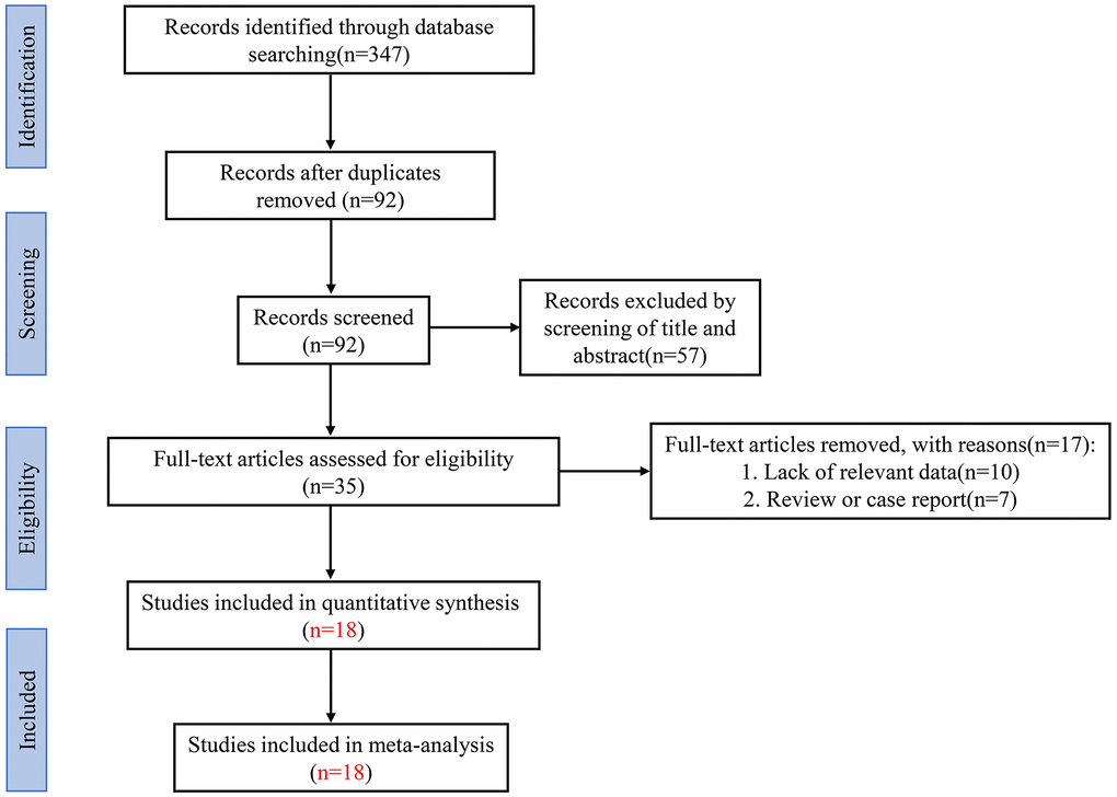 The detailed steps and processes of the article retrieval and selection were displayed in Figure 1. A total of 347 articles were revealed in the initial literature search. However, we selected 35 studies in strict accordance with inclusion and exclusion criteria. Subsequently, after screening the full texts of the remaining 35 articles, another 17 studies were excluded. Finally, only 18 articles included 1303 cancer patients were fully in conformity with the screening criteria and enrolled in the current meta-analysis [15–18, 22, 23, 25–36].