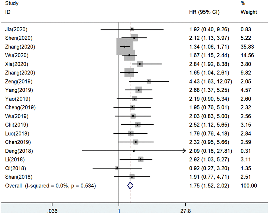 A total of 18 eligible studies with a sample of 1303 patients were recruited to evaluate the expression level of SNHG7 on OS. The pooled HR was 1.75 (95% CI: 1.52-2.02, P = 0.000), which indicated that the high expression of SNHG7 was significantly related to shorter overall survival (Figure 2). Since there was no heterogeneity between the studies (I2 = 0.0%, P = 0.534), a fix-effect model was applied to analyze the HR and 95% CI of OS. Our analysis showed that the up-regulated SNHG7 expression had a positive correlation with the worse overall survival in cancer patients.