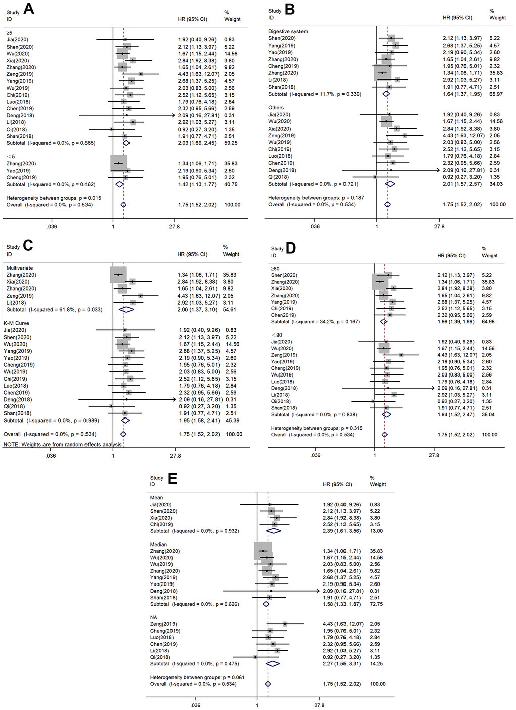 In order to further explore the correlation between SNHG7 expression and the OS, all included patients were classified, based on follow-up time, cancer types, analysis types, sample sizes and cut off, to perform the subgroup analysis of OS.