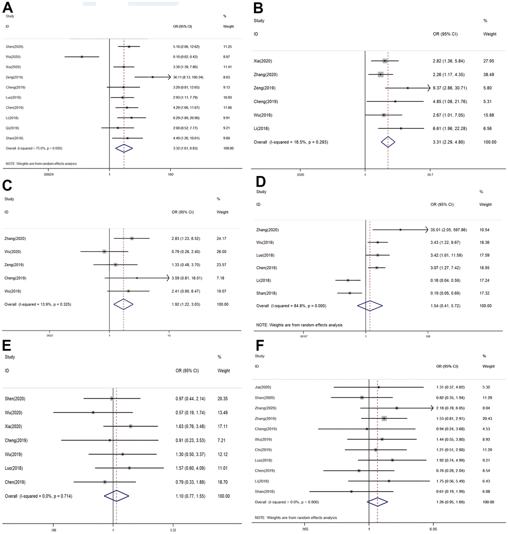 There were five studies describing how SNGH7 involved in histological grading. The analysis showed that OR was 1.92, 95% CI was 1.22–3.03 (P =0.005, Figure 4C). These data supported poor histological grade was accompanied with elevated SNGH7 expression. A fixed-effects model was used for no heterogeneity in this analysis (I2 = 13.9%; P = 0.325). There was no statistical significance observed in DM (OR =1.54, 95% CI = 0.41–5.72, P=0.522), age (≥60 vs.< 60, OR = 1.10, 95% CI: 0.77-1.55, P = 0.604), and gender (female vs. male, OR = 1.26, 95% CI: 0.95-1.69, P = 0.113) (Figure 4D–4F).