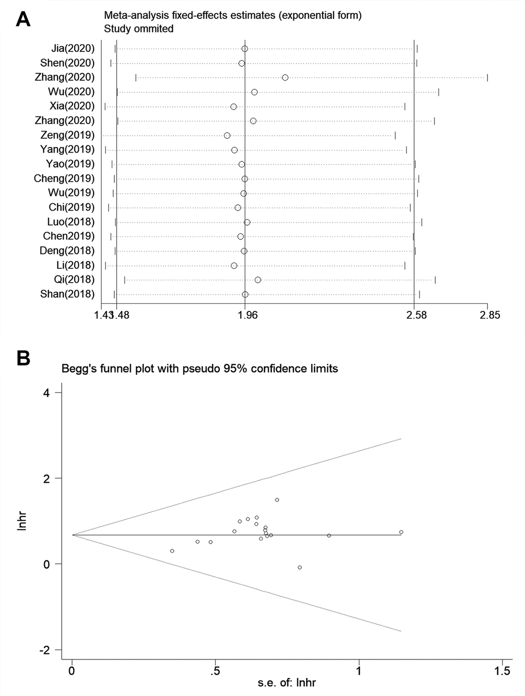 Sensitivity analysis was to examine whether the OS was interfered by individual studies. There was no significant influence on the pooled results when any individual study was removed. At last, we found that the HR values and the synthesized results were stable and reliable (Figure 5A). According to Begg’s tests, the symmetrical shape of the funnel plot indicated that no significant publication bias existed in the study (P=0.649, Figure 5B).