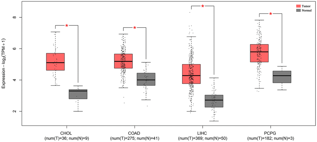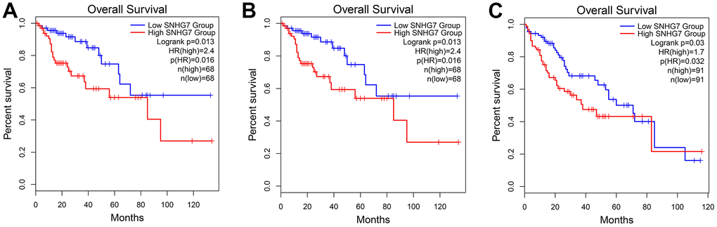We exploited online analysis software the Gene Expression Profiling Interactive Analysis (GEPIA) to further explore the differential expression of SNHG7 among cancer tissues. All data are based on The Cancer Genome Atlas (TCGA) database. and We set P < 0.01 as the cut-off value to compare TCGA various neoplasms data with normal group. In order to assess the correlation between SNHG7 expression and OS, we’ve chosen Kaplan-Meier method and log-rank test to calculate the survival analysis.