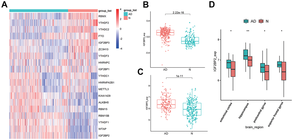 Based on published literature [43, 44], we brought 19 m6A-related genes into our analysis, and the expression levels of these 19 genes were extracted from 624 samples of GSE33000. Differentially expressed analysis showed that among the 19 m6A regulators, the expression of IGF2PB2 in AD patients was significantly higher than that of normal brains (Figure 1A). Further comparison of IGF2PB2 expression between AD and normal samples in three data sets (GSE33000, GSE48350 and GSE5281) also showed that IGF2BP2 expressed more in AD patients than in normal people (GSE33000: log2FoldChange = 0.170, p<2.22e-16, Figure 1B; GSE48350 and GSE5281: log2FoldChange = 1.488, p=1e-11, Figure 1C). Moreover, considering the heterogeneity of brain tissue, we also explored the expression of IGF2BP2 in different brain regions in GSE48350. It showed that IGF2BP2 was highly expressed in entorhinal cortex, hippocampus, postcentral gyrus and superior frontal gyrus in AD patients compared with normal tissue (Figure 1D). These results preliminarily indicated that IGF2PB2 was abnormally highly expressed in AD patients, this phenomenon might be related to the pathogenesis and development of AD.
