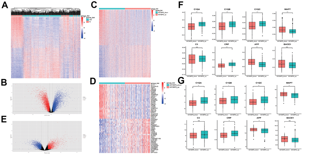To further find genes that related to IGF2BP2 in AD, first of all, we obtained 13968 differentially expressed genes (DEGs) between AD and normal tissues in GSE33000 (Figure 2A, 2B). Among them, there were 6918 increased genes and 7050 decreased genes in AD patients. Then, we divided AD patients into two groups according to the median expression level of IGF2PB2 and compared to get 9908 DEGs related to IGF2PB2 expression status (Figure 2C–2E). After intersecting the two DEG sets, we took the shared genes as the relevant gene sets of IGF2PB2 affecting AD occurrence for subsequent analysis.