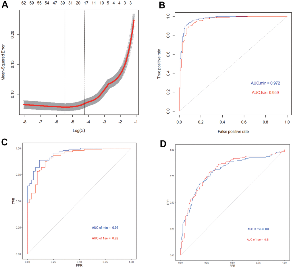 To build a diagnostic model that could maximally distinguish AD from normal brain samples, least absolute shrinkage and selection operator (LASSO) regression was applied using “glmnet” package to select most representative features in hub genes obtained from the most valuable module in WGCNA analysis. A model index for each sample was created using the regression coefficients from the LASSO analysis to weight the expression value of the selected genes with the following formula: