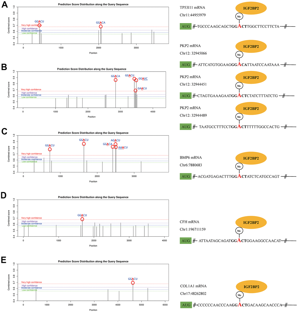 To initially explore whether IGF2BP2 and hub genes from WGCNA and LASSO analysis could constitute a m6A-dependent mechanism, SRAMP online database (http://www.cuilab.cn/sramp) and RMBase V2.0 online tools were applied. SRAMP could predict the precise location of m6A modification on mRNAs and provide the confidence of every modification site, while RMBase V2.0 could further inquire whether these modification sites could be specifically recognized and bounded by IGF2BP2.