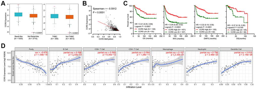 CCR5 is overexpressed in breast cancer in comparison to matched normal control (Supplementary Figure 1, P < 0.0001). Its expression level in basal-like breast cancer or TNBC are significantly higher than in non-basal-like or non-TNBC samples (Figure 1A, expression data is obtained from bc-GenExMiner database, P < 0.0001). Methylation level of CCR5 promoter region was significantly associated with CCR5 expression (Spearman r = 0.5912, P < 0.0001, Figure 1B), which meant that methylation might be one of the main regulators of CCR5 expression. As is shown in Figure 1C, Kaplan–Meier analyses indicated that CCR5 expression was positively correlated with overall survival (OS), recurrence free survival (RFS) and distant metastasis-free survival (DMFS) (merged TNBC gene expression data and corresponding clinical information were from KM plot, HR = 0.41, 0.39 and 0.32; P = 0.0007, <0.0001 and <0.0001, respectively), which was further confirmed by analyzing TCGA TNBC data (OS, HR = 0.37, P = 0.0185). Tumor immune cell infiltration analyses using TIMER in basal-like breast cancer samples showed that adjusted CCR5 expression was significantly correlated with tumor infiltration of B cell, CD8+ T cell, CD4+ T cell, Neutrophil and Dendritic cell (P < 0.0001), while there was no correlation between CCR5 expression and Macrophage infiltration (P = 0.233) (Figure 1D).
