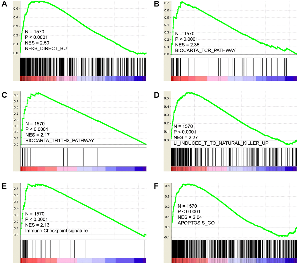 Since CCR5 is overexpressed in TNBC/basal-like breast cancer and is associated with better survival and tumor immune cell infiltration, we wish to elucidate the potential roles of CCR5 in breast cancer using an expression profiling dataset containing 1570 breast cancer samples. GSEA analyses results (Figure 2) indicated that CCR5 expression was positively correlated with innate inflammation pathways such as NF-κB pathway (Figure 2A, NES = 2.5, P < 0.0001). It was also associated with TCR pathway, Th1Th2 pathway, T cell to Natural killer pathway and immune checkpoint related signatures (Figure 2B–2E, NES = 2.35, 2.17, 2.27, 2.13, respectively, all P < 0.0001). Moreover, CCR5 was associated with apoptosis (Figure 2F, NES = 2.04, P < 0.0001). These results indicated that CCR5 might repress breast cancer progression through NF-κB pathway, immune cell activation and pro-apoptosis.
