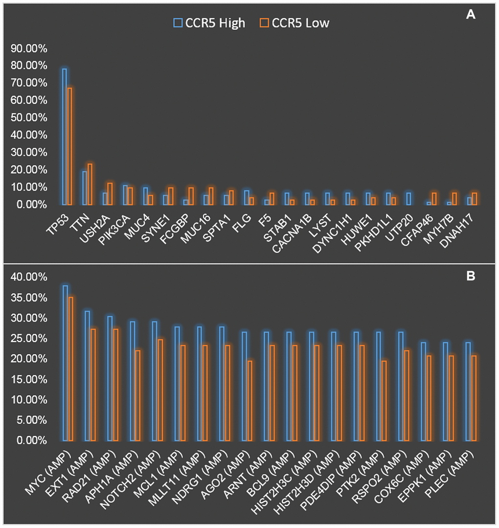 Next, the genomic landscape of TNBC patients with CCR5 high and low expression were compared and presented in Figure 3. Figure 3A shows the comparison of mutation profiles between CCR5 high and low groups. We can see that TP53 has the highest mutation rate both in CCR5 high and CCR5 low TNBC patients (78.08% vs. 67.12%). Since the mutation rate of TP53 in breast cancer is around 30%, the high mutation rate of TP53 in TNBC indicates its potential role in TNBC progression. The following mutated genes are TTN, USH2A and PIK3CA etc. (19.18% vs. 23.29%, 6.85% vs. 12.33% and 10.96% vs. 9.59%, respectively). Figure 3B presents the comparison of CNA profiles between CCR5 high and low groups. The top three gene with copy number variation are MYC, EXT1 and RAD21 (Amplification, 37.97% vs. 35.06%, 31.65% vs. 27.27% and 30.38% vs. 27.27%, respectively). Detailed mutation and CNA profiling data comparison were presented in Supplementary Table 1.
