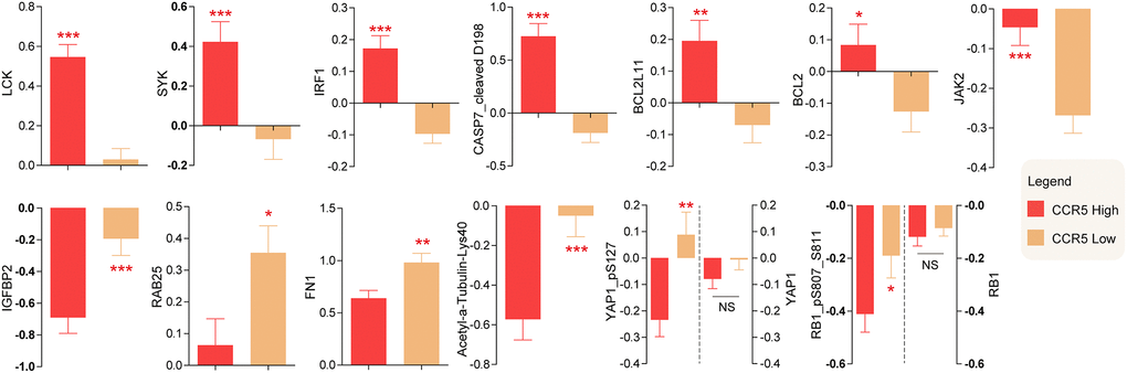 Reverse phase protein array (RPPA) data of TNBC, which containing 226 antibodies, was downloaded from TCGA. Differentially changed proteins were computed and top changed proteins were presented in Figure 5 (For detailed information, please see Supplementary Table 1). LCK, SYK, IRF1, CASP7_cleaved D198, BCL2L11, BCL2 and JAK2 were higher in TNBC patients with high CCR5 expression, while IGFBP2, RAB25, FN1, Acetyl-α-tubulin-Lys40, YAP1_pS127, RB1_pS807_S811 were lower in CCR5 high TNBC patients. There are no statistical differences of YAP1 and RB1 between CCR5 high and CCR5 low TNBC patients. These proteomic changes might partly account for CCR5 associated good prognosis.