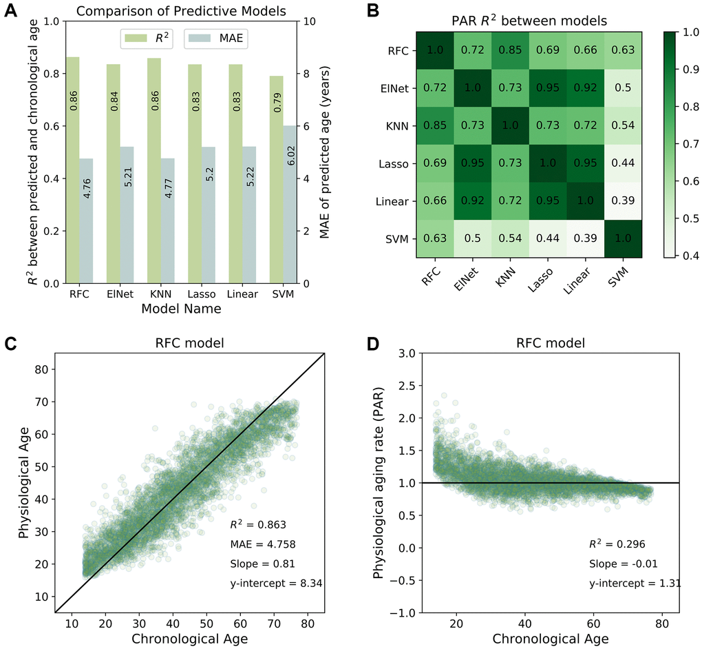 To measure the predictive performance of the different predictive models, we employed several statistical metrics to determine the accuracy of model-predicted physiological age with respect to chronological age.