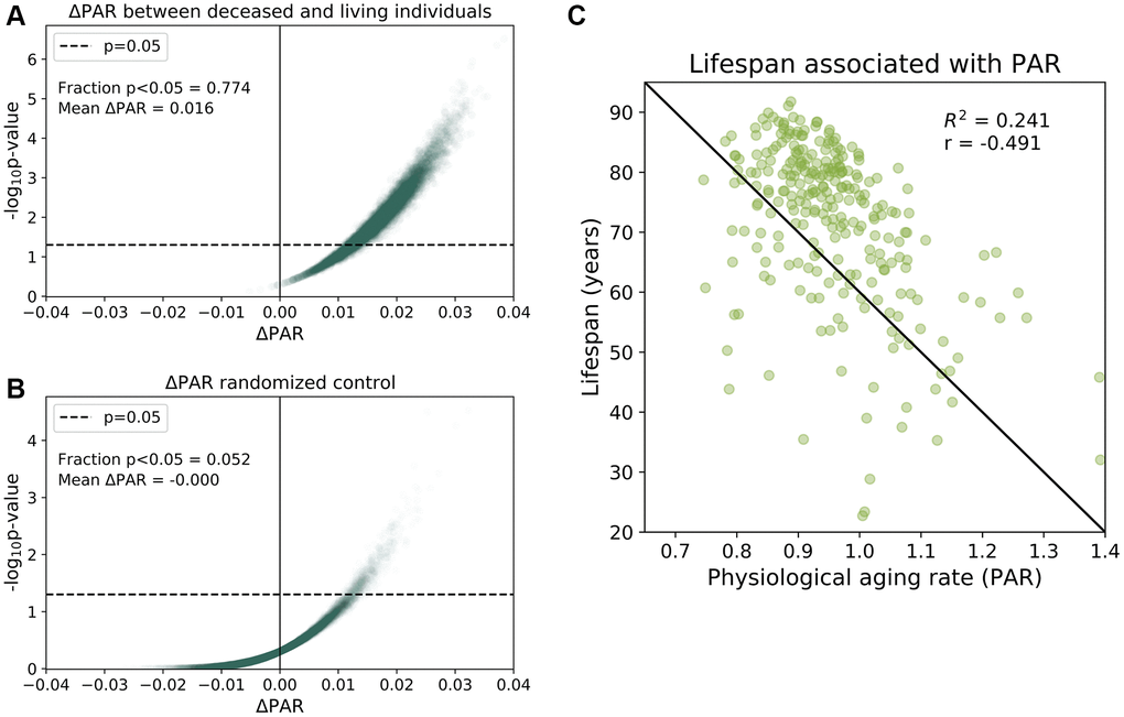 To provide more evidence for the association between PAR and mortality, we then randomly age-matched deceased individuals with living participants and compared their aging rates. We performed 100,000 randomizations and found that 77.4% of the age-matched comparisons had significant differences (p < 0.05) in the mean PAR values of the deceased and living subjects with a mean ΔPAR of 0.016 (Figure 2A). Nearly all random age-matched comparisons reported ΔPAR > 0 (Figure 2A). In contrast, the randomized control showed, as expected under null, few (5.2%) p-values < 0.05 and a mean ΔPAR = 0.00 (Figure 2B). Furthermore, lifespans of these individuals were negatively correlated with the corresponding PARs in both the full-trait model (r = −0.491, Figure 2C) and common-trait model (r = −0.469, see Supplementary Figure 11). These results all suggest that individuals with lower PARs outlived their counterparts with higher PARs.