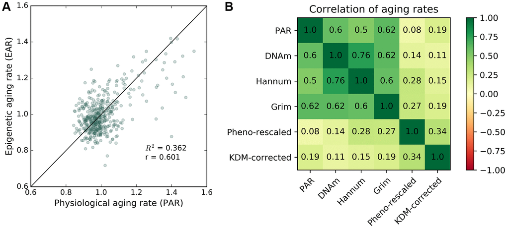Correlation of physiological aging rate (PAR) with epigenetic aging rate (EAR)