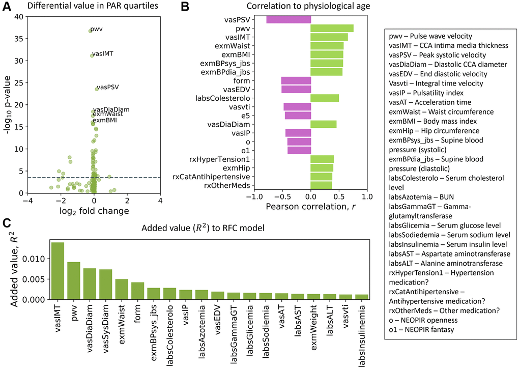 We used machine learning to infer an individual’s PAR (see Materials and Methods for details), the ratio between physiological age and chronological age, from their physiological profile (i.e., set of quantitative trait values) by comparing that profile to the trait values of other participants in the study (“training data”). For example, a 50-year-old man might have a physiological profile (values of body mass index, pulse wave velocity, NEOPIR assertiveness, etc.) that predicts a physiological age of 48 years. As a result, he would have PAR = 48/50 = 0.96 − i.e., aging slower than expected for his chronological age peers.