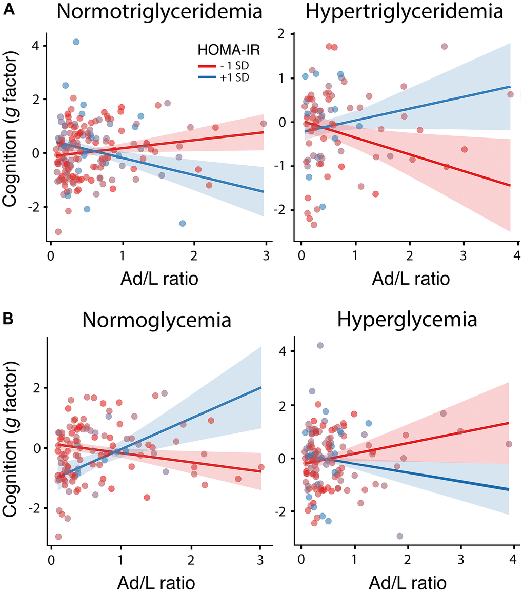 The ANOVAs applied to compare the null and experimental models revealed a significant three-way interaction of the Ad/L ratio and HOMA-IR with the triglyceride (F1,222 = 9.1, p = 0.003, δ = 2.44, CI0.95 [0.32 4.56]) and glucose component of MetS (F1,222 = 8.9, p = 0.003, δ = -2.95, CI0.95 [-4.83 -1.09]). In the first case, the alternative hypothesis was approximately 18 times more likely than the null hypothesis (BF10 = 17.65), and in the second case 11 times more likely (BF10 = 11.11). Tables 2, 3 show the estimates, t-values and p-values for each parameter of these models. The Ad/L ratio was positively associated with cognitive functioning for decreased levels of HOMA-IR (i.e., at 1 SD below the mean) if triglyceride levels were normal, and for elevated levels of HOMA-IR (i.e., at 1 SD above the mean) if glucose levels were normal. These results are illustrated in Figure 1A, 1B, respectively.