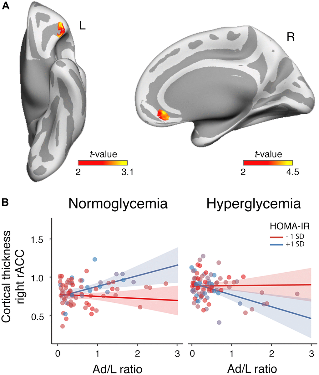 Having determined that the association between the Ad/L ratio and cognitive functioning is moderated by HOMA-IR and by glucose and triglyceride levels, we wanted to assess whether these predictors also moderated the association of Ad/L with cortical thickness.