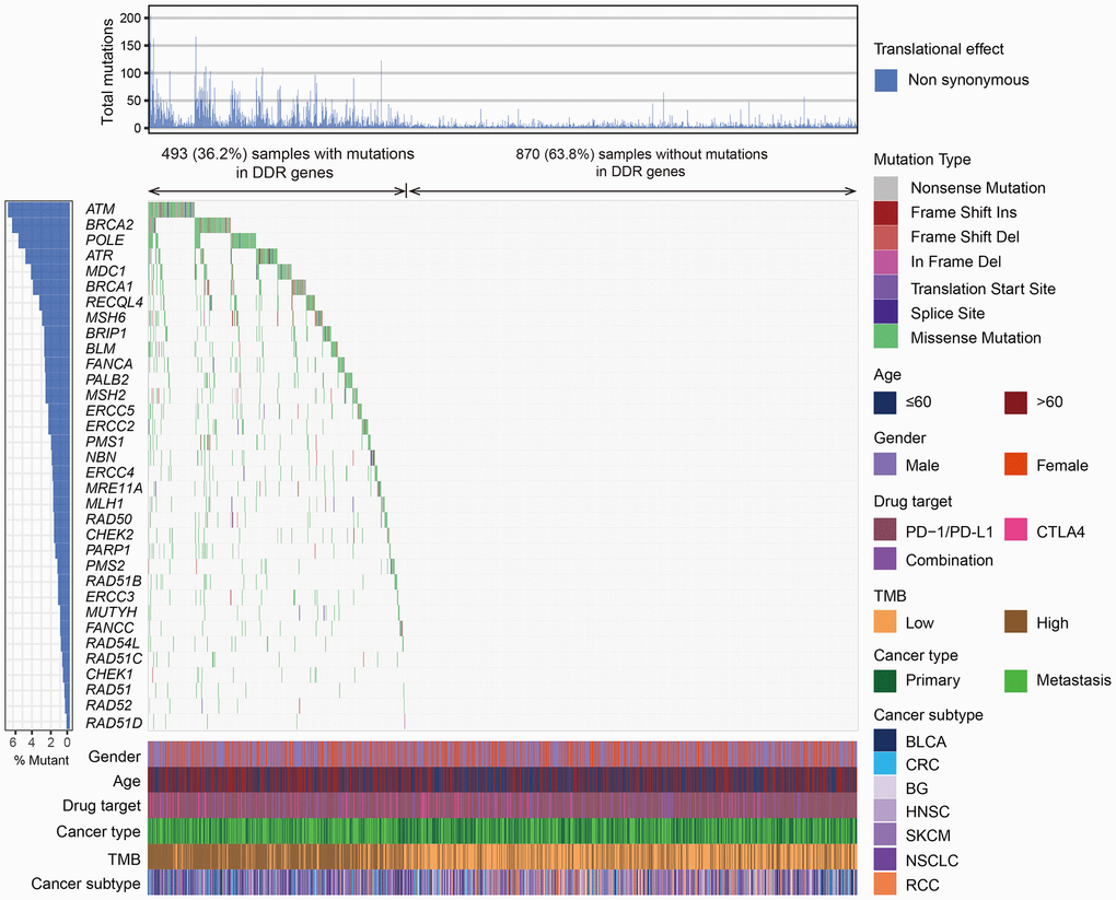 Overall, 493 (36.2%) tumors harbored mutations in at least one DDR gene and 870 (63.8%) tumors were the DDR wild-type subgroup. The mutational patterns of 34 DDR genes were illustrated in Figure 1.