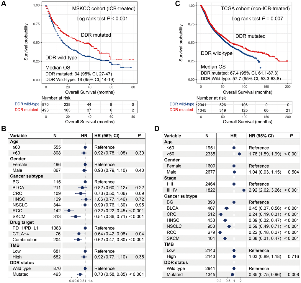 We evaluated the prognostic ability of DDR mutations in 7 distinct cancer subtypes with MSKCC and TCGA cohorts. In this section, multivariate Cox models with confounders adjusted were performed only when survival curves were statistically significant.