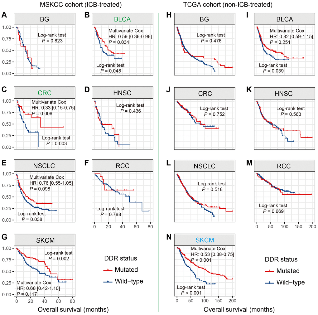 DDR mutations were not correlated with patients’ survival in BG, HNSC, NSCLC, and RCC in both MSKCC and TCGA cohorts (all Log-rank test P > 0.05; Figure 3A, 3D, 3F, 3H, 3K, 3L, 3M).