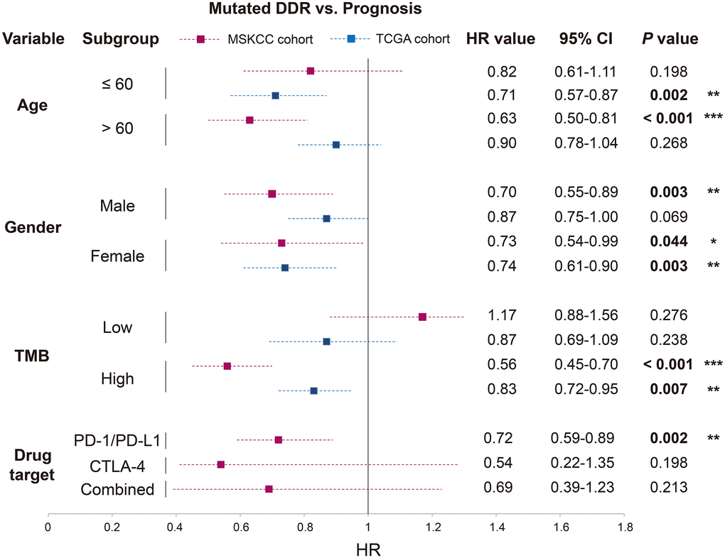 To illuminate whether the immunotherapy and prognostic implications of DDR mutations were influenced by specific clinical factors, we performed stratified analysis and multivariate Cox regression model of DDR mutations in distinct subpopulations with MSKCC and TCGA data.