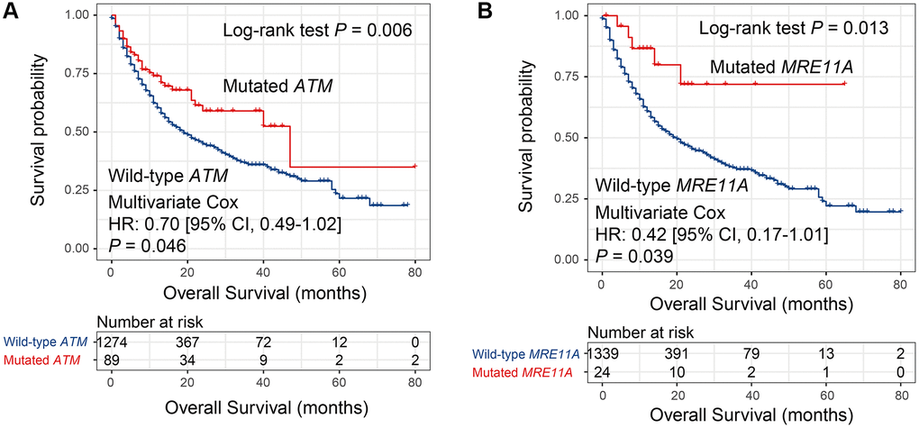 Besides, in the TCGA cohort, Kaplan-Meier survival analysis revealed that 3 DDR genes (i.e., MSH6, BRCA1, and ATR) mutations were related to the survival outcome (all Log-rank P < 0.05; Supplementary Figure 2). And this association remained still significant even adjusted for confounding variables (all multivariate-adjusted P < 0.05; Supplementary Figure 3). Mutations in BRCA1 or ART were correlated with better survival outcomes, however, MSH6 mutations were predictive of worse prognosis.