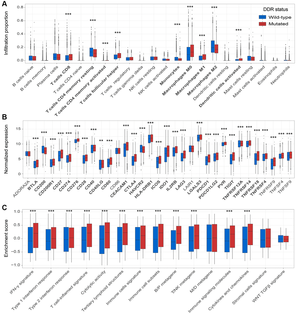 Based on the gene expression data from the TCGA cohort, we calculated and evaluated the enrichment of 3 factors in the microenvironment (i.e., tumor infiltration immune cells, immune checkpoint, and immune-related signatures) according to DDR mutation status.