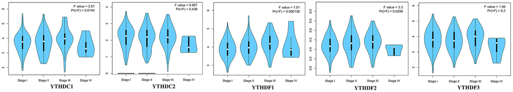 Then, we explored the association between the expression profiles of YTH domain family and the pathological stages of HCC patients. As shown in Figure 2, YTHDC1 expression (p = 0.0144), YTHDF1 expression (p = 0.000138) and YTHDF2 expression (p = 0.0206) displayed a positive correlation with pathological stage. These data suggested that aberrant expression of YTH domain family members might participate in disease progression in HCC patients.